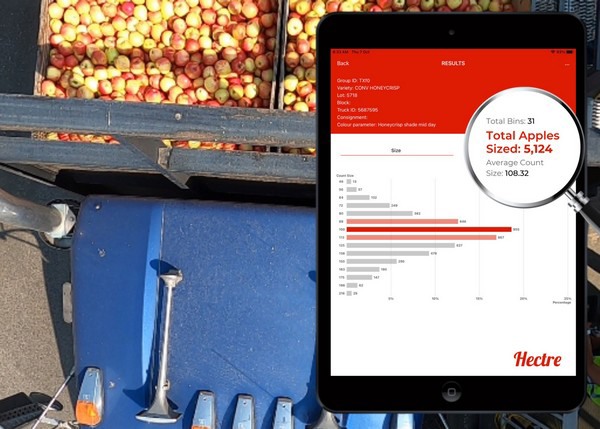 L'application portable de calibrage des fruits Spectre d'Hectre détecte et calibre plus de 100 morceaux de fruits par bac à partir d'une simple photo prise sur un iPad standard. Les résultats du calibrage sont disponibles en quelques secondes. Grâce à sa mobilité et à sa simplicité, l'application peut être utilisée dans le verger dès la cueillette des fruits ou dans l'entrepôt de conditionnement, ce qui permet d'augmenter considérablement le nombre de données fiables sur le calibre afin de mieux informer la cueillette, le conditionnement, le transport et les ventes.