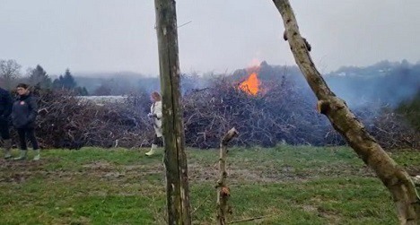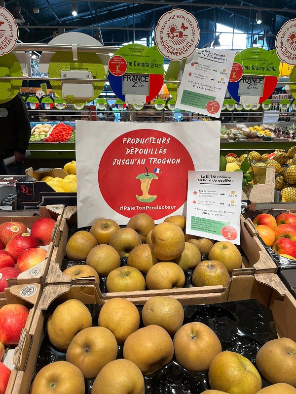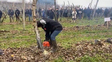 « Les premiers arrachages de vergers de pommiers qui ont eu lieu dès le 14 janvier ne marquent que le début de la fin du verger français de pommiers, si la production des arboriculteurs n’est pas rémunérée au juste prix ». A Angers, Avignon, Montauban, en Limousin et dans les Hautes Alpes, plusieurs centaines de producteurs ont ainsi mené des opérations de brulage et d’arrachage de vergers, de tronçonnage ainsi que des actions d’étiquetage de pommes en magasins « Producteurs dépouillés jusqu’au trognon ».