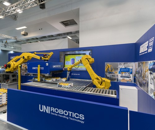 Pour les dattes, en revanche, on trouve UNI Intelligent Pack Dates, la solution robotique capable de disposer les dattes dans les plateaux de manière à ce qu'elles soient orientées dans la même direction. Parallèlement à cette application robotique de traitement des produits sur laquelle la marque Unisorting est spécialisée, l'espace dédié à UNI Robotics a présenté une solution robotique capable de palettiser des caisses selon la configuration souhaitée et personnalisée à l'aide de deux robots coordonnés.