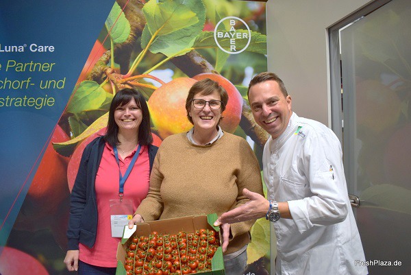 De gauche à droite : Yvonne Dojahn, Grit Vogt et un autre collègue de Bayer CropScience Deutschland présentent la « Roundita » au salon Fruchtwelt Bodensee 2023 à Friedrichshafen