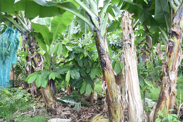 Sur son exploitation de 60 hectares, Patrick Aubery pratique l’agroforesterie sur une dizaine d’hectares. Précurseur sur l’arrêt des insecticides grâce à l’enherbement permanent, l’objectif de Patrick Aubery est de réussir à améliorer les sols tout en cultivant de la banane. « Tout l’enjeu est de trouver le bon équilibre en rajoutant des plantes tout en ayant une banane de qualité et productive. Car plus il y a de plantes plus les systèmes sont résilients face aux aléas climatiques ». Pas moins de 5 variétés sont ainsi réunies sur une même parcelle : la banane, culture principale, l’herbe, la plante de couverture comme le Desmodium, le cacaoyer et l’eucalyptus.