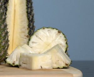 A droite, l'ananas Sugar Loaf se caractérise par sa forme cylindrique et sa chair intérieure blanche