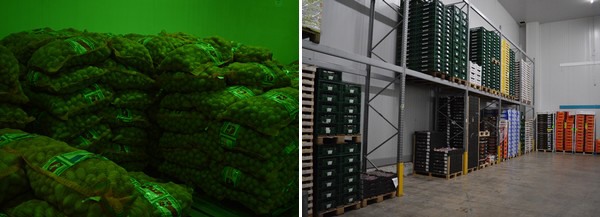 À gauche : entrepôt de pommes de terre éclairé à la lumière verte. À droite : aperçu de l'entrepôt de légumes