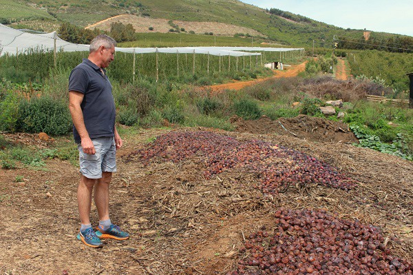 Dans sa dernière lettre d'information, Hortgro présente un producteur de prunes sur le tas de compost où ont été jetées ses prunes devenues trop vieilles pour être exportées.