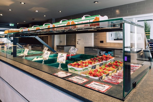 Par rapport à l'ancien magasin de la ferme, Spargelhof Strampe dispose aujourd'hui d'une surface de vente trois fois supérieure, ce qui a permis de construire à la fois une zone réfrigérée normale et un rayon de produits surgelés. Compte tenu des exigences structurelles, deux sections, un comptoir d'asperges et un comptoir de baies, ont finalement dû être mises en place. Les deux comptoirs ont des vitres frontales rabattables, ce qui permet de travailler à la fois en mode service et en mode libre-service. En outre, à la fin de la saison des asperges et des baies, les comptoirs peuvent être utilisés sans réfrigération comme étagères ou présentoirs pour d'autres produits. Les étagères de présentation à l'intérieur du comptoir sont réglables en hauteur et peuvent donc être facilement adaptées à la profondeur des caisses ou des plateaux.
