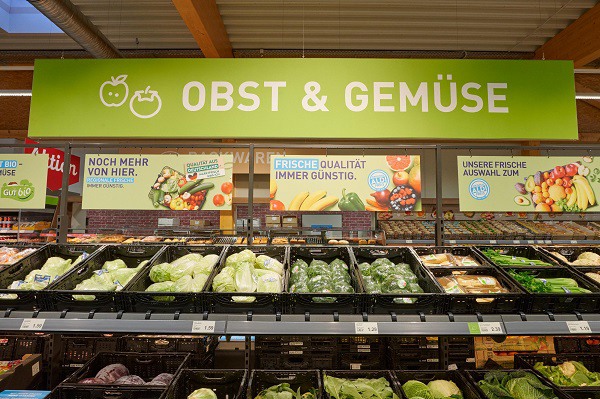 En accord avec les baisses de prix permanentes, le discounter place les fruits et légumes frais au centre de sa nouvelle campagne marketing, réalisée en collaboration avec Aldi Süd : des carottes croquantes, des asperges fraîches et des salades bien vertes en gros plan. Sous le slogan « Täglich frisch, immer günstig » (N.d.T: « Tous les jours frais, toujours bon marché »), des fruits et légumes frais sont promus chaque semaine au meilleur prix avec la promesse de prix bas d'Aldi, attirant ainsi l'attention. La campagne mise sur le triptyque prix, produit et labels importants.