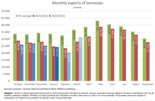 Le marché de la tomate a été tendu cet hiver et au début du printemps. Par rapport à l'hiver dernier et à la moyenne quinquennale, l'UE a importé plus et aussi un peu plus qu'en février. Le Maroc est un fournisseur important, tandis que la Turquie a également exporté un peu plus de tomates par rapport à l'année dernière.