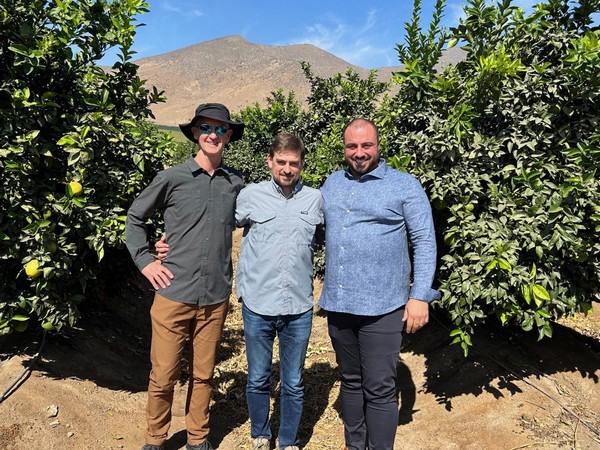 De gauche à droite : Patrick Haines, vice-président exécutif, Andrés Haloua, directeur des ventes et de l'approvisionnement, et Michel Matouk, PDG de World Fresh Produce, rendent visite à des producteurs chiliens avant le début de la saison des importations d'agrumes.