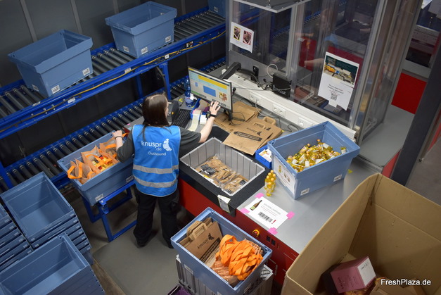 Les employés remplissent les caisses sous la grille. Photo : Knuspr