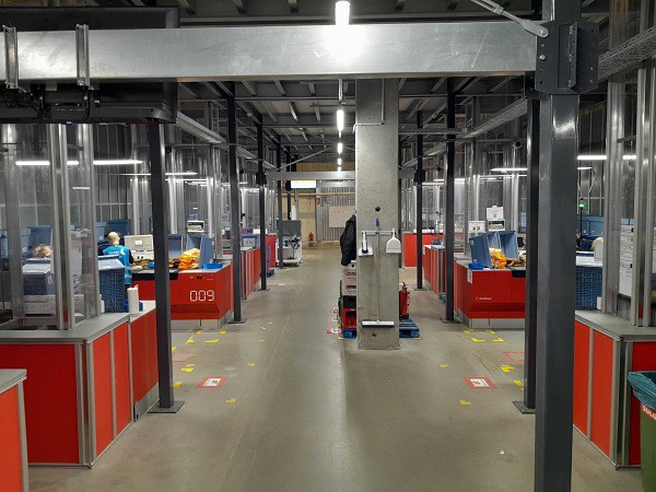 Une employée prend une caisse vide sur le tapis roulant, qu'elle remplit avec les commandes correspondantes. La commande a été préalablement transmise à l'Autostore par le système de gestion de la clientèle et affichée sur un écran. Chaque caisse reçoit un code-barres spécifique qui correspond à une commande particulière.