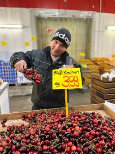 À droite : l'employé Azizi Shoheb présentant des cerises espagnoles