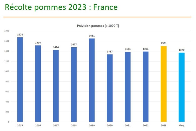 Chiffres variétés Clubs et internationales : Golden devrait atteindre 358 000 tonnes (+10,8 % par rapport à 2022), Gala 279 000 T +6,9 % par rapport à 2022, Granny Smith 139 000 T (+2 % par rapport 2022). Parmi les variétés club, Cripps Pink avec 163 000T affiche -14,2 % par rapport à 2022 marquant un retour à la stabilité après une récolte très élevée l’an dernier, mais avec un taux d’emballage bien meilleur que l’an passé ; et +15 % pour Juliet cette année. La production des variétés terroir (Belchard, Chantecler, Reinette grise du Canada, Reine des reinettes…) est en légère augmentation (+2 % par rapport à 2022).