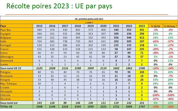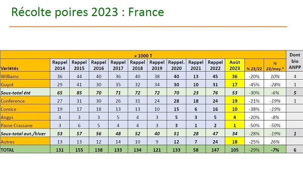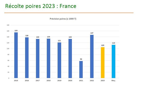 Si l’an dernier les chiffres étaient bons, cette année la poire française affiche une baisse de 28,6 % (par rapport à 2022) et de 6,8 % par rapport à la moyenne triennale. Une baisse attribuée au phénomène d’alternance et conséquence directe de la canicule de l’an dernier.