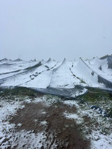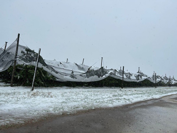 « Il a commencé à neiger vers six heures du matin », raconte Kerryn Fyvie, de l'exploitation agricole Fyvie. « Il n'est pas normal que nous ayons de la neige si tard en octobre, alors les filets étaient déjà fermés au milieu pour cause de gel et de grêle. La neige est devenue très lourde sur le filet, elle ne roule pas comme la grêle, ce qui fait peser un poids important sur la structure. »