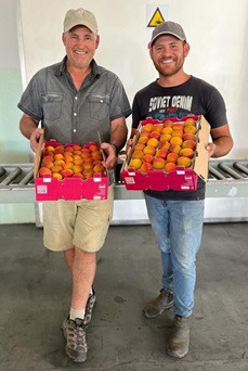 A droite : Pierre Burger, propriétaire de Protea Farm, et Wayne Schoeman, directeur de la ferme, avec leurs premiers abricots Carmingo de la saison