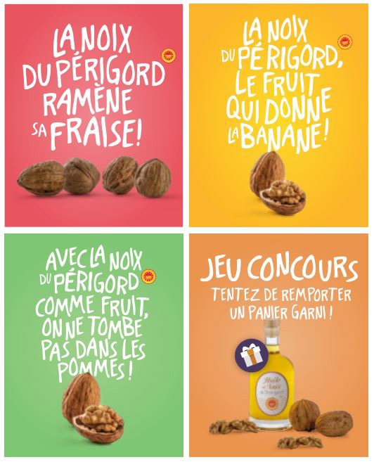 Jeu-concours, campagne publicitaire digitale, partenariats, événements : la Noix du Périgord déploie en solo sa campagne promotionnelle sur les réseaux sociaux avec cette année de nouvelles affiches (insérer visuels) et des slogans qui font mouche comme « La Noix du Périgord ramène sa fraise ». Une campagne également axée sur la santé, puisque le syndicat veut rappeler les bienfaits nutritionnels du fruit.