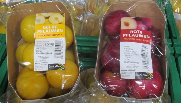 Prunes rouges et jaunes en barquettes de 500 gr pour le marché autrichien