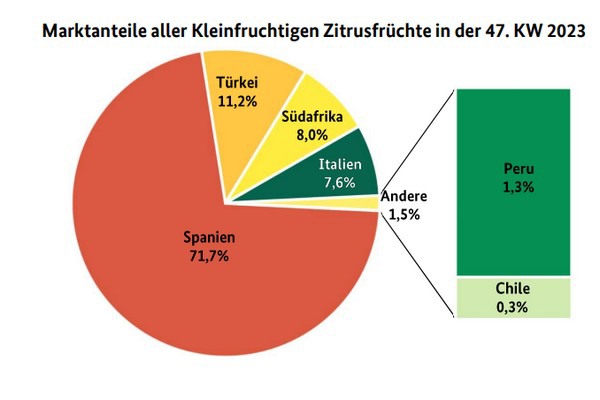 En ce qui concerne les Satsumas, seules les importations turques pouvaient être achetées en Allemagne. Celles-ci sont devenues plus faciles à trouver. En termes de calibre, les fruits sont généralement de bonne qualité. La demande étant bonne, ils se vendent assez facilement ; à Berlin, ils coûtent entre 11 et 15 euros par paquet de 9 kg. Toutefois, selon le BLE, les Satsumas n'ont généralement qu'un caractère complémentaire dans un assortiment dominé par les clémentines espagnoles. Les Clemenules et les Oronules ont convaincu par leurs propriétés organoleptiques et se sont donc souvent vendues sans difficulté.