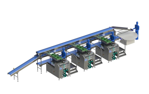 La ligne de pesage automatique peut également être directement connectée à une ligne de conditionnement en flowpack. Si plusieurs lignes de pesage automatiques sont connectées en ligne sur le flowpacker, une capacité totale de jusqu'à 4 000 emballages par heure peut être atteinte.