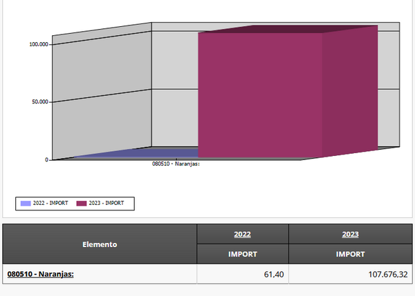 Si l'on compare les données relatives aux importations d'oranges égyptiennes en Espagne entre 2022 et 2023, il est indéniable que les achats ont augmenté de façon spectaculaire en une seule année.