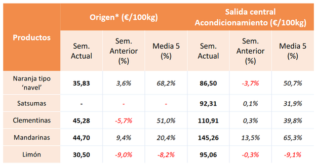 Les mandarines affichent une augmentation significative de 9,4 % dans le champ avec l'arrivée sur le marché de variétés de plus grande valeur, ce qui place le prix 20,4 % au dessus de la moyenne de cette semaine. À la sortie du centre, il y a eu un rebond significatif de 13,5 %, de sorte que le prix est 65,3 % au-dessus de la moyenne hebdomadaire, le plus élevé des dix dernières années pour cette semaine.