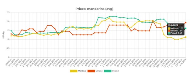 La Turquie étant le premier exportateur mondial de mandarines, cette situation a eu un impact sur les prix dans la région. Dans les pays d'Europe de l'Est, les prix des mandarines fraîches ont augmenté de manière assez significative au cours des dernières semaines. La majeure partie de la hausse a été observée en Ukraine, où les prix de gros ont augmenté de 30 %. En Moldavie, les prix des mandarines ont augmenté de 11 % au cours des deux dernières semaines.
