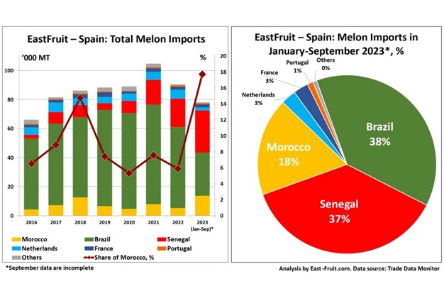 Des melons provenant de 22 pays ont été livrés sur les marchés espagnols et, jusqu'à récemment, la part du Maroc dans la structure globale des importations était de 6 à 8 %. Depuis que les producteurs marocains ont réussi à livrer un volume record au pays en 2023, la part du Maroc est passée à 18 %. En conséquence, le pays nord-africain s'est hissé à la troisième place des fournisseurs de melon de l'Espagne, dépassant les Pays-Bas, et devrait y rester d'ici la fin de l'année.