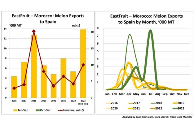 Le Maroc exporte régulièrement du melon vers l'Espagne depuis de nombreuses années. Au cours de cette période, les volumes d'approvisionnement annuels ont varié entre 4 et 8 mille tonnes. La seule exception a été 2018, lorsque plus de 12 mille tonnes de melons ont atteint les marchés espagnols. L'Espagne a été confrontée à une sécheresse en 2017-2018, qui a entraîné une pénurie d'eau et un faible rendement des produits locaux, ce qui a contraint le pays à augmenter ses importations.