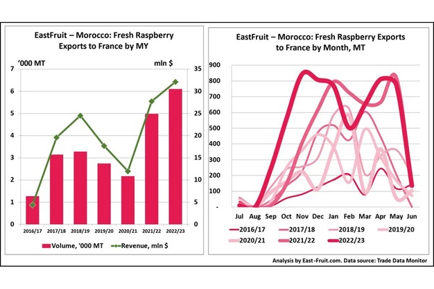Selon EastFruit, le Maroc a établi un nouveau record pour l'exportation de framboises fraîches vers la France, sur la base des résultats de la saison 2022/23. De plus, les producteurs marocains ont été les principaux contributeurs à la croissance globale des importations de framboises fraîches en France.