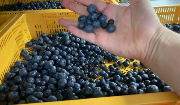 Tunnel de séchage de myrtilles : les baies humides sont placées à l'entrée sur le tapis roulant pour être séchées dans le tunnel par de l'air conditionné. Les baies sont ensuite transportées directement vers l'entrepôt frigorifique pour y être traitées