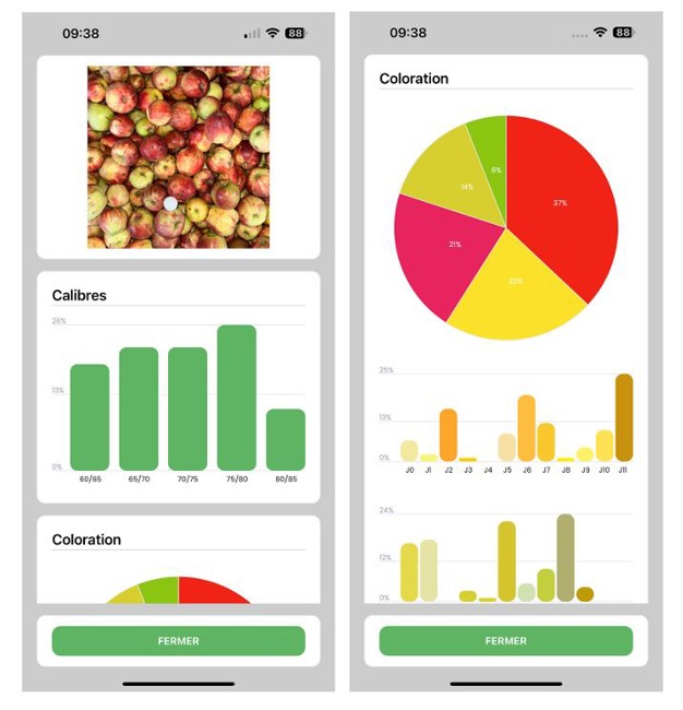 « Le résultat est lisible 2 secondes après avoir pris la photo du palox », précise Mathieu. « Au fur et à mesure des palox, avec une vingtaine de photos nous sommes capables de donner un agréage calibre et coloration à 95 % juste par rapport au précalibrage ». L’innovation réside dans l’efficacité et la rapidité du système puisque l’évaluation est quasi instantanée grâce à l'intelligence artificielle qui automatise et accélère le processus. Et le tout hors connexion. « On a une visibilité assez incroyable sur la qualité de nos lots directement sur le lieu de récolte, avant même qu’elles n’arrivent en station de conditionnement ». Résultat ? « Une gestion des récoltes améliorée, un gain de temps non négligeable (puisque d’ordinaire l’opération se fait manuellement) et une augmentation de la fiabilité des données collectées ». PommaQuality peut être intégrée à l’application PommaFlow et se veut évolutive car ses créateurs n’excluent pas l'ajout d’autres fruits ou critères qualité.