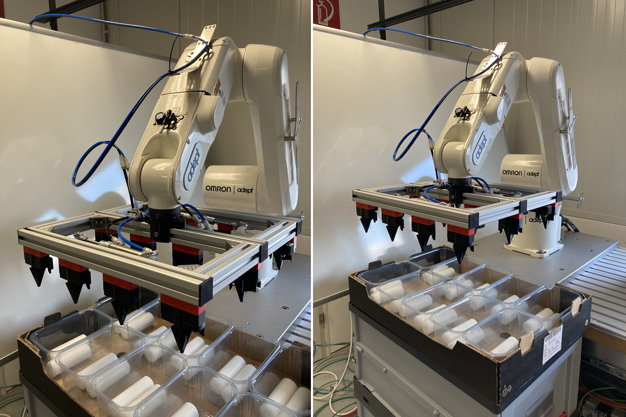 Avec une ligne entièrement neuve destinée à optimiser le processus de traitement de l'endive chez Reijnpack, l'entreprise d'automatisation MDE Automation, basée à Tholen, a fait ses premiers pas dans le secteur des fruits et légumes il y a trois ans. Le fondateur Edwin Denissen a alors décelé d'autres possibilités d'automatisation dans ce secteur. Le dernier développement en date est une pince qui peut prendre des barquettes en plastique contenant des fruits et des légumes dans des boîtes et les placer à l'endroit souhaité ou encaisser des barquettes qui sortent de la ligne d'emballage.