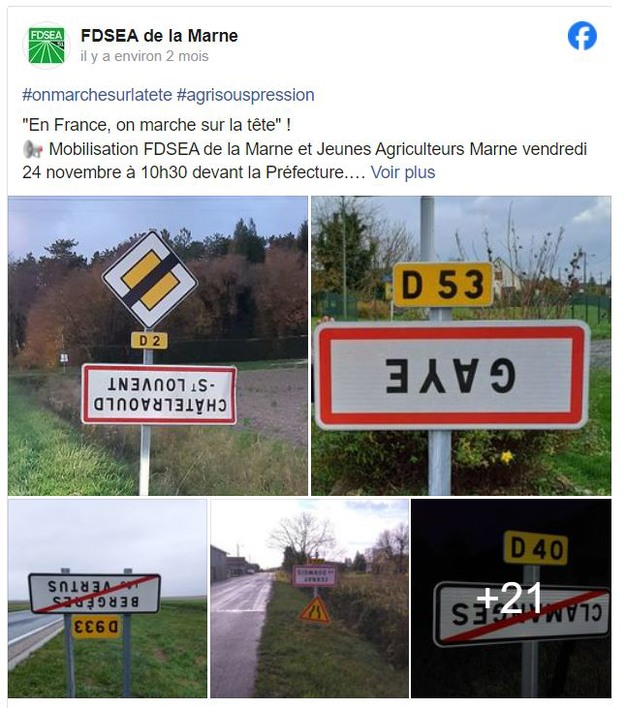 A l'initiative des deux syndicats agricoles FNSEA et JA, des milliers panneaux signalétiques ont été retournés pour « dénoncer les injonctions contradictoires » du gouvernement.