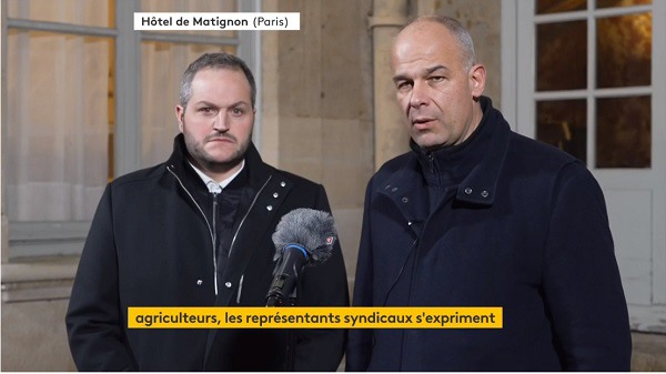 Arnaud Gaillot des Jeunes agriculteurs et Arnaud Rousseau de la FNSEA, lundi 22 janvier a la sortie d'un entretien avec le Premier ministre, fraîchement nommé, Gabriel Attal / © Capture d'écran FranceInfo