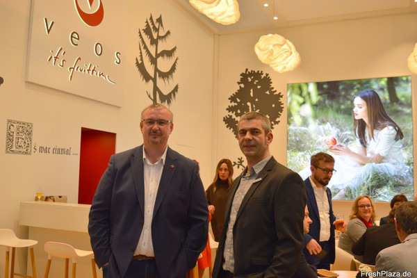 Dieter Heerklotz (Sachsenobst) et Lars Viertel (Saale Obst) sur le stand de VEOS lors du salon Fruit Logistica de l'année dernière. La distribution des fruits frais produits par la SOVG est assurée par VEOS