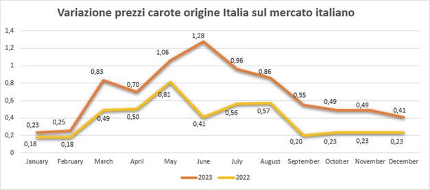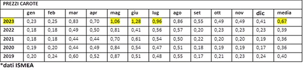Barbieri poursuit : « La carotte de Vénétie, celle que nous traitons principalement chez Zanarini, arrivera sur les marchés vers la mi-mai, lorsque le produit sicilien sera probablement épuisé et que l'Europe aura besoin de marchandise. Ces prémisses nous permettent de supposer que nous pourrons reproduire une bonne campagne avec le produit italien et nous font penser que les prix tirés par les exportations resteront à des niveaux moyens à élevés, si ce n'est à des prix comparables à l'année dernière, au cours du trimestre mai/juillet, (comme le montrent les données mises en avant dans le tableau ci-dessous). »