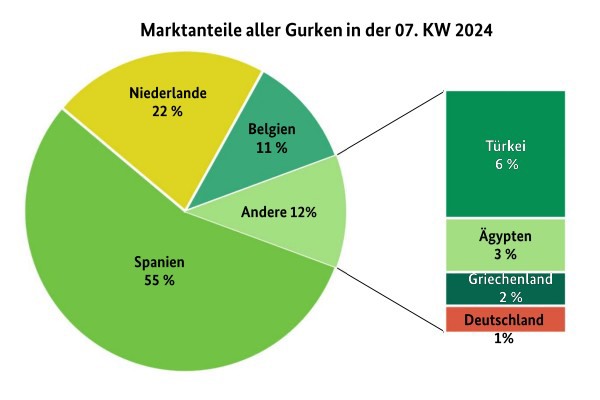 Les concombres espagnols ont constitué la base de l'assortiment. Par ailleurs, des offres néerlandaises étaient également disponibles. Les arrivages belges n'ont pas été présents sur tous les marchés tandis que les arrivages grecs n'ont été présents qu'à Berlin. Les affaires ont démarré plutôt lentement, l'intérêt ne s'intensifiant qu'à partir du mercredi des Cendres ou au plus tard le jeudi. Les cotations ont évolué de manière similaire, généralement avec une légère baisse en début de semaine, avant de repartir à la hausse. Globalement, l'offre et la demande se sont toutefois équilibrées, si bien que les besoins ont toujours pu être satisfaits selon BLE.