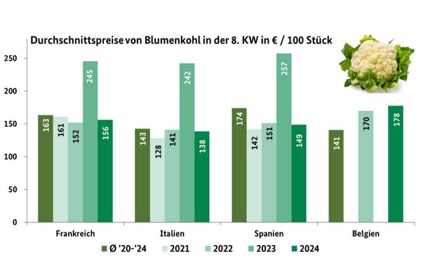 Les offres de choux-fleurs français et italiens ont formé la base de l'assortiment. Les arrivages espagnols sont venus compléter l'offre, tandis que les produits belges étaient présents, dans une moindre mesure, uniquement à Cologne. Quant aux produits espagnols, on les cherchait en vain à Hambourg. Selon la BLE, la disponibilité a toutefois suffi à couvrir les besoins. Les possibilités de stockage se sont améliorées à certains endroits, mais sur certains marchés, l'intérêt a stagné en raison des températures élevées.