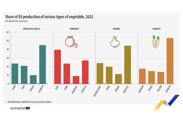Les Pays-Bas étaient le premier producteur d'oignons, avec près d'un quart (24 %) des oignons récoltés dans l'UE, devant l'Espagne (20 %) et la France (12 %). Les principaux producteurs de carottes étaient l'Allemagne (18 % du total de l'UE), la France (15 %) et la Pologne (14 %).