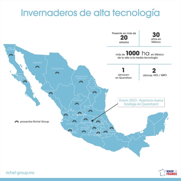 Après l'ouverture de ses bureaux à Querétaro en 2014, Richel Mexico a récemment inauguré de nouvelles installations de stockage là-bas : une bodega de 1000m² dédiée à leurs matériaux et équipements de serre, tels que l'irrigation, le chauffage, l'électricité et les systèmes d'automatisation. « Cette initiative fait partie de notre stratégie pour rapprocher nos filiales de nos clients et fournisseurs, en fournissant un meilleur service local », ajoute Barthelemy. De plus, l'entreprise dispose également d'un bureau à Guadalajara.
