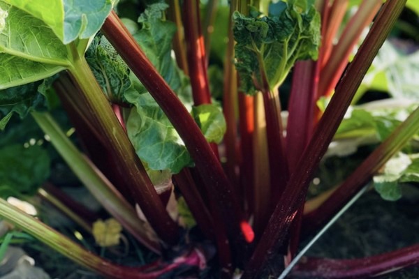 Rhubarbe fraîchement récoltée. Une partie de la récolte est également transformée en jus de rhubarbe