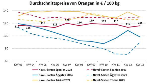 Selon le BLE, même si la saison touche à sa fin, de nombreuses offres sont encore disponibles. Les produits espagnols continuent de dominer le marché. La présence des oranges égyptiennes Valencia Late et Salustiana s'est maintenue, tandis que les variétés turques Navel ont connu une légère baisse. L'offre espagnole d'oranges s'est déplacée de plus en plus de la variété Navelate vers la variété Lane Late en fin de saison. Au fur et à mesure de l'avancement de la saison, la demande a commencé à diminuer et, avec le ralentissement de la rotation des marchandises, les prix des stocks égyptiens et espagnols ont dû être gérés avec plus de souplesse par endroits.