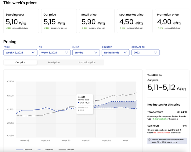« Nous constatons que le marché des fruits et légumes est aujourd'hui très axé sur la production et que, par définition, il faut rapidement gérer les excédents. Grâce à notre technologie de données, nous donnons aux entreprises un aperçu plus précis des volumes auxquels elles peuvent s'attendre au cours d'une semaine donnée, en prévoyant également les coûts d'approvisionnement. Si vous savez six semaines à l'avance que vous pouvez vous attendre à un excédent, vous pouvez maintenant chercher d'autres opportunités de vente à un stade plus précoce. Ce faisant, nous réduisons le gaspillage alimentaire sur le marché et aidons les coopératives et les grossistes à faible marge à améliorer leur rentabilité. »