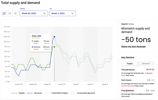 En outre, les prévisions concernant le volume attendu de l'offre et de la demande se traduisent par un meilleur alignement de la chaîne d'approvisionnement, ce qui permet de réduire les coûts opérationnels et le gaspillage. « Ce modèle de prévision est jusqu'à 25 % plus précis que les propres prévisions des entreprises. » Les utilisateurs peuvent ainsi prendre des décisions fondées sur des données de manière rentable, ce qui permet également de réduire la perte de valeur des produits. « Ce gaspillage n'est pas toujours reconnu comme tel sur le marché, mais si un produit est vendu à une valeur inférieure, il s'agit également d'une forme de gaspillage », explique Snoeker.