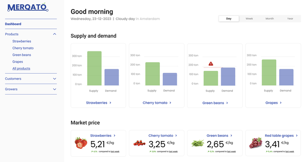 Merqato a commencé par un modèle pour les fraises, les tomates, les raisins et les haricots verts. « Chaque groupe de produits a sa propre dynamique, qu'il soit cultivé en serre ou en plein air, en Europe occidentale ou en Afrique du Nord. Ce sont tous des produits qui sont vendus quelques semaines après la cueillette. À terme, nous souhaitons étendre notre activité à d'autres groupes de produits, mais nous voulons d'abord construire notre modèle pour ces produits. »