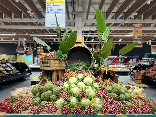Pour marquer le début du printemps, Grosbusch a choisi de mettre en avant divers produits de saison via une théâtralisation haute en couleurs dans le magasin de Leclerc Maizieres-les-Metz/Hauconcourt. Ainsi, une jolie composition de choux-fleurs, d'artichauts, de radis roses et rouges, de carottes bottes et d'asperges blanches trône au centre du rayon fruits et légumes. « Nous avons choisi ces produits car ils correspondent à la saison mais aussi parce-que les couleurs s'harmonisent très bien ensemble, c'est une parfaite combinaison entre esthétique et saisonnalité. Nous sortons de la période hivernale et les consommateurs veulent changer leur alimentation. Ils n'en peuvent plus des agrumes et des légumes d'hiver. Si, par chance, le soleil s'invite sur la semaine, c'est là pour nous une superbe occasion de proposer ces produits qui égayent les rayons et animent les consommateurs », rapporte Anthony, Account Manager chez Grosbusch.