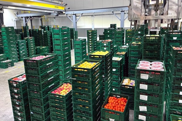 Les caisses de produits frais peuvent peser jusqu'à 20 kilos. Les camions sont chargés à 2 mètres de hauteur, et charger des caisses de 20 kg à cette hauteur représente souvent un défi pour les travailleurs humains ; la technologie logistique aide à rendre leur travail plus facile.