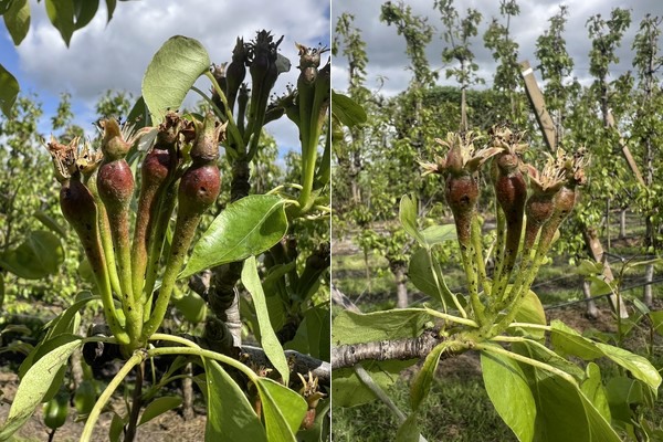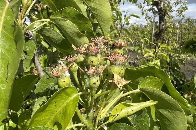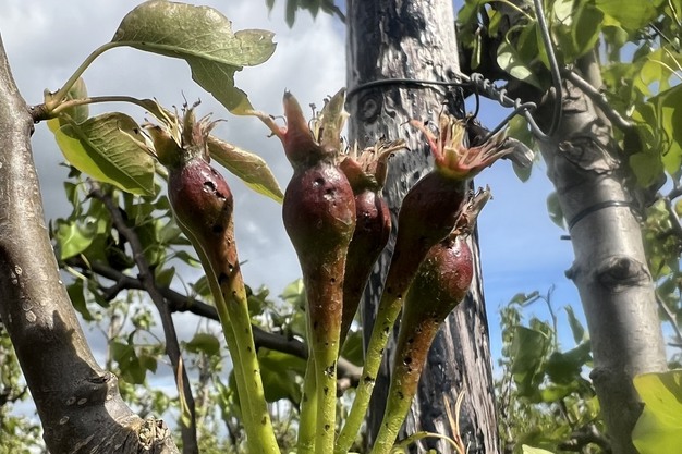 « Les courriels et les appels téléphoniques ont afflué toute la semaine. Les rapports de dégâts proviennent de tous les Pays-Bas et de Belgique et concernent principalement des parcelles de poires, qui se trouvent actuellement dans une phase cruciale de la fructification. Pour les pommes, il n'y a pas ou peu de dégâts visibles pour l'instant, mais cela pourrait changer. En outre, nous avons reçu quelques rapports concernant les baies, en particulier les myrtilles », a déclaré Pietjan Visser.