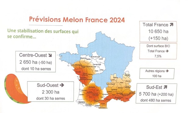 Jeudi à medFEL ont été dévoilées les traditionnelles anticipations de plantation melons pour la France, l'Espagne et le Maroc. Si la stabilisation des surfaces se confirme en France, l'Espagne connait cette année une nouvelle baisse. Les surfaces au Maroc sont quant à elles en légère hausse. Le point sur la campagne 2024 et les enjeux de la filière, par l'Association Interprofessionnelle du Melon.