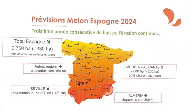 « Une tendance baissière préoccupante » pour la zone Murcia/Alicante, qui a perdu 50 % de ses surfaces en 4 ans (un total de 2 000 hectares cette année avec une baisse de 200 hectares pour cette campagne). Une baisse qui serait « multifactorielle » selon l'AIM : forte pression sur le foncier, accès à l'eau, normes environnementales qui se durcissent, principalement sur les zones côtières et des coûts de production en forte augmentation. « La filière melon pour les origines Maroc et Espagne est dans un tournant », ajoute Myriam Martineau , faisant référence au manque d'eau et à l'interdiction de planter au Maroc.